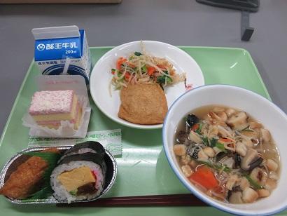 今日は、卒業をお祝いして「のり巻き・いなり寿司」と、会津地方ではお祝いの膳として欠かすことのできない「こづゆ」そして「おひたし」「きつねもち」「お祝いデザート」です。