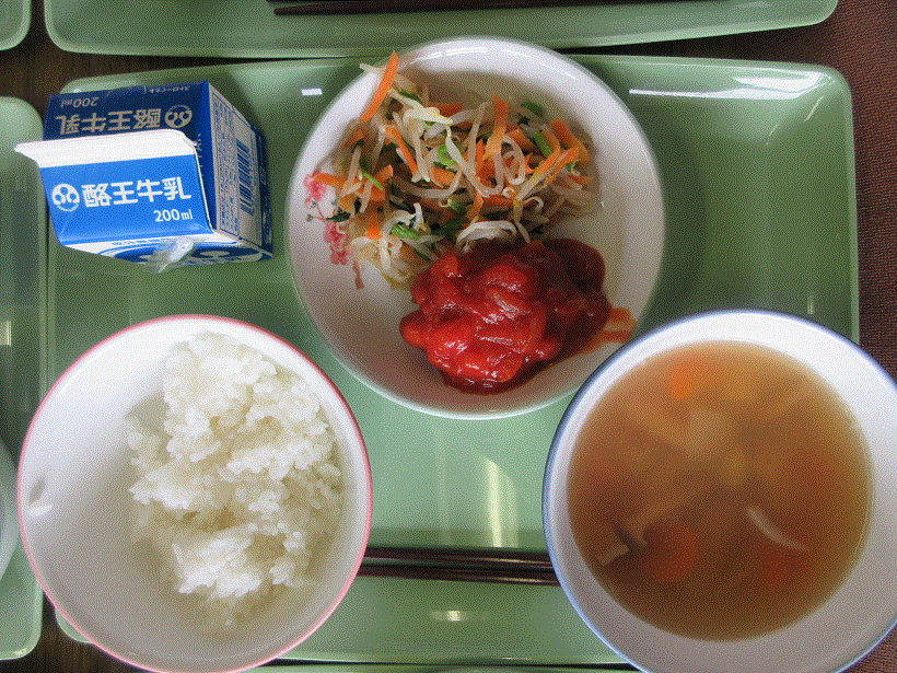 さて、今日の給食は、鶏から揚げサルサソースはトマトの味たっぷりのソースです。スープはアサリの味がおいしいです。。