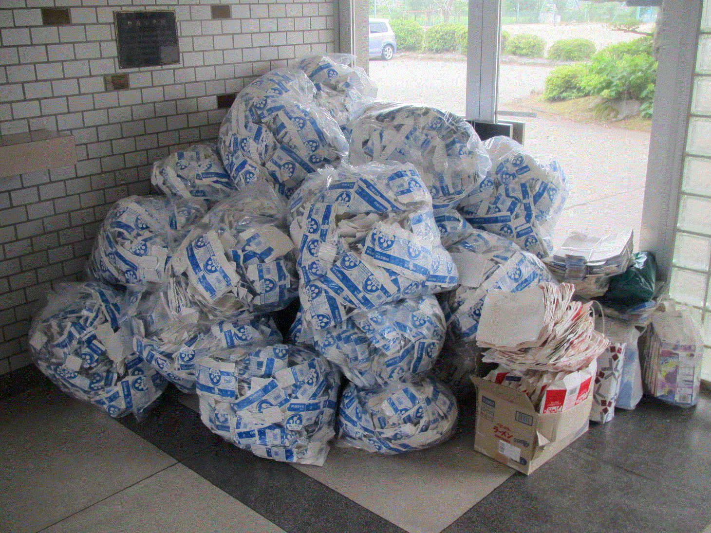 生徒会JRC委員会が集めた、リサイクルに出す牛乳パックです。