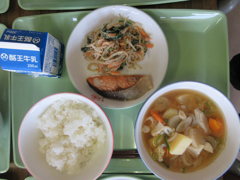 さて、今日の給食は、ごま和え、焼き魚、けんちん味噌汁で日本食です。