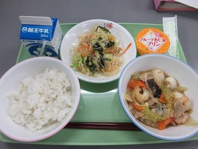 今日の八宝菜には、豚肉・うずら卵・しいたけ・たけのこ・たまねぎ・にんじん・はくさい・もやし・あさり・いか・えびと11種類の具材がはいっています。
