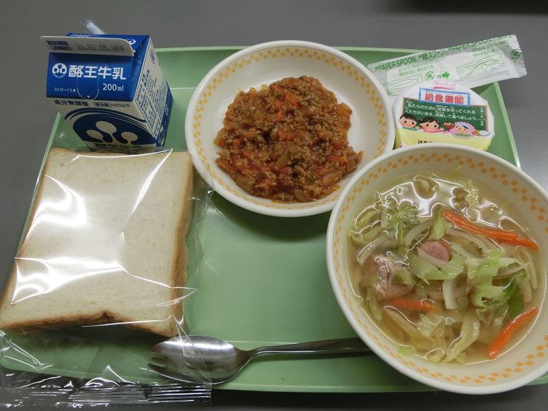 2020年1月28日 18時35分〈献立〉食パン 牛乳 ミートサンド 野菜のコンソメスープ ゼリー