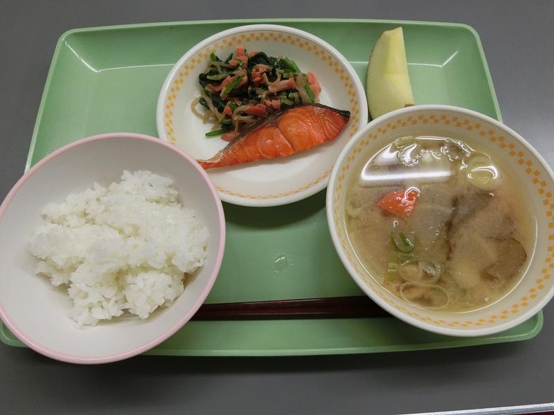 2020年1月29日 18時52分〈献立〉ごはん 牛乳 ずいきの味噌汁 くるみ和え 鮭の塩焼き りんご