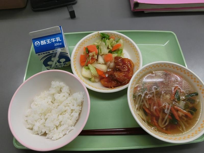 2020年1月30日 14時18分〈献立〉麦ごはん 牛乳 鶏肉のチリソース 浅漬け ワンタンスープ