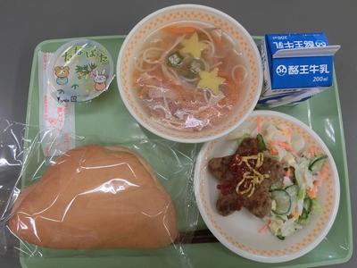 2020年7月7日 19時13分献立 (パ ン)(牛 乳)(七夕スープ)(星のサラダ)(星のハンバーグ)(星のゼリー)