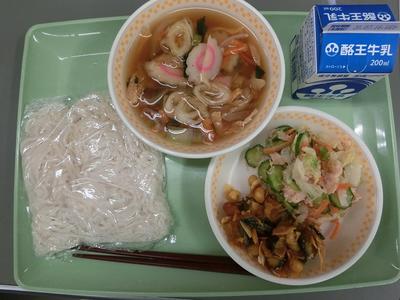 2020年7月8日 18時59分献立(ソフトめん)(牛 乳)(うどんかけ汁)(チキンサラダ)(かぼちゃナッツ)