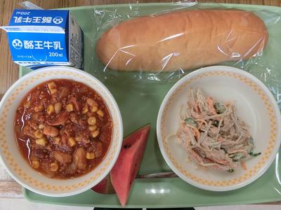 2020年7月21日 19時47分献立(黒パン)(牛 乳)(チリコンカン)(ごぼうサラダ)(小玉スイカ)
