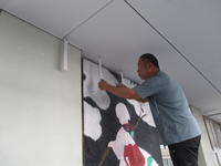 美術室前の作品展示では、鈴木技能主査にも手伝っていただきながら進めています。