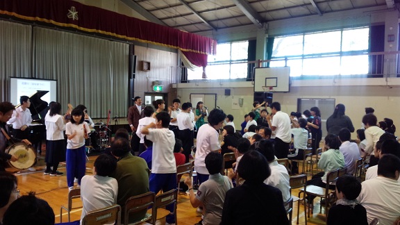 中でも盛り上がったのは、代表の子供たちも参加しての演奏交流でした。「花祭り」という曲に合わせてみんなで打楽器などを演奏し、会場が一体となって祭りの雰囲気を作っていました。