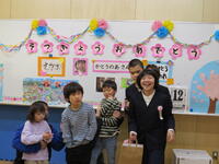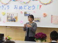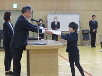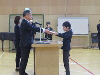 「今日で1年間の学習が修了します。この修了証書は、一人一人が1年間勉強、運動、学校行事をがんばり、できることが増えたこと。春休みが終わると4月から進級できることを証明したものです。先生の話をよく聞いて、健康に気を付けて、友達と仲良く生活し、1年間大きく成長したことをうれしく思います。来年で創立60年を迎えます。これからも笑顔で学校生活を送ってほしいです。」との話がありました。