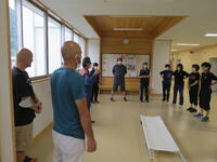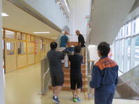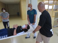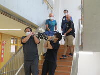 疾病者をタンカで搬送する訓練を行いました。階段の昇り降りでは、疾病者が地面と平行になるように工夫して搬送しました。