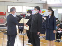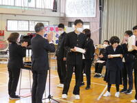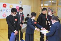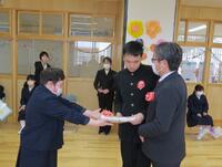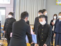 卒業生代表は、校長より卒業記念品(学校、PTA、進路協議会、教育委員会)を受け取りました。
