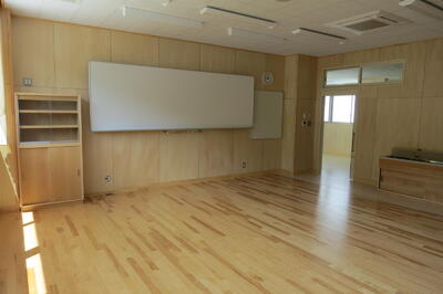 教室の正面には、左から順に、収納棚、ホワイトボード(上下スライド式)、掲示板があります。