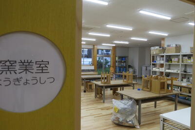 ものづくり棟1階には、紙工室、加工室、木工室、窯業室があります。