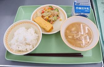 「かみかみこんだて」 厚焼きたまご 切り干し大根のサラダ 里芋のみそ汁 ごはん 牛乳