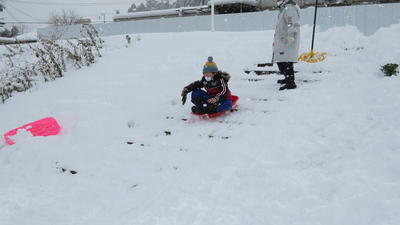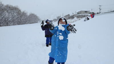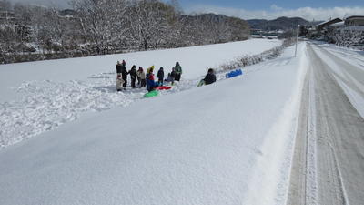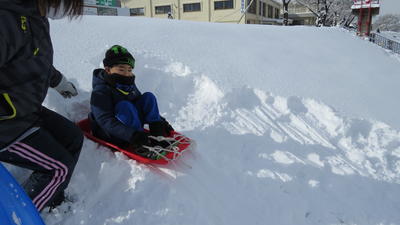 12月17日(木)校舎前の土手は、雪がたくさん積もってそりをすべり放題でした。