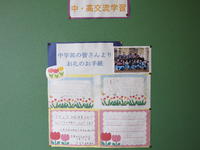 今週はいろいろありましたが、廊下には、車椅子バスケットボール体験教室や現場実習の想いで新聞、中高交流活動の球根植えなど、学習してきた活動を振り返ってまとめた作品がが飾ってありました。