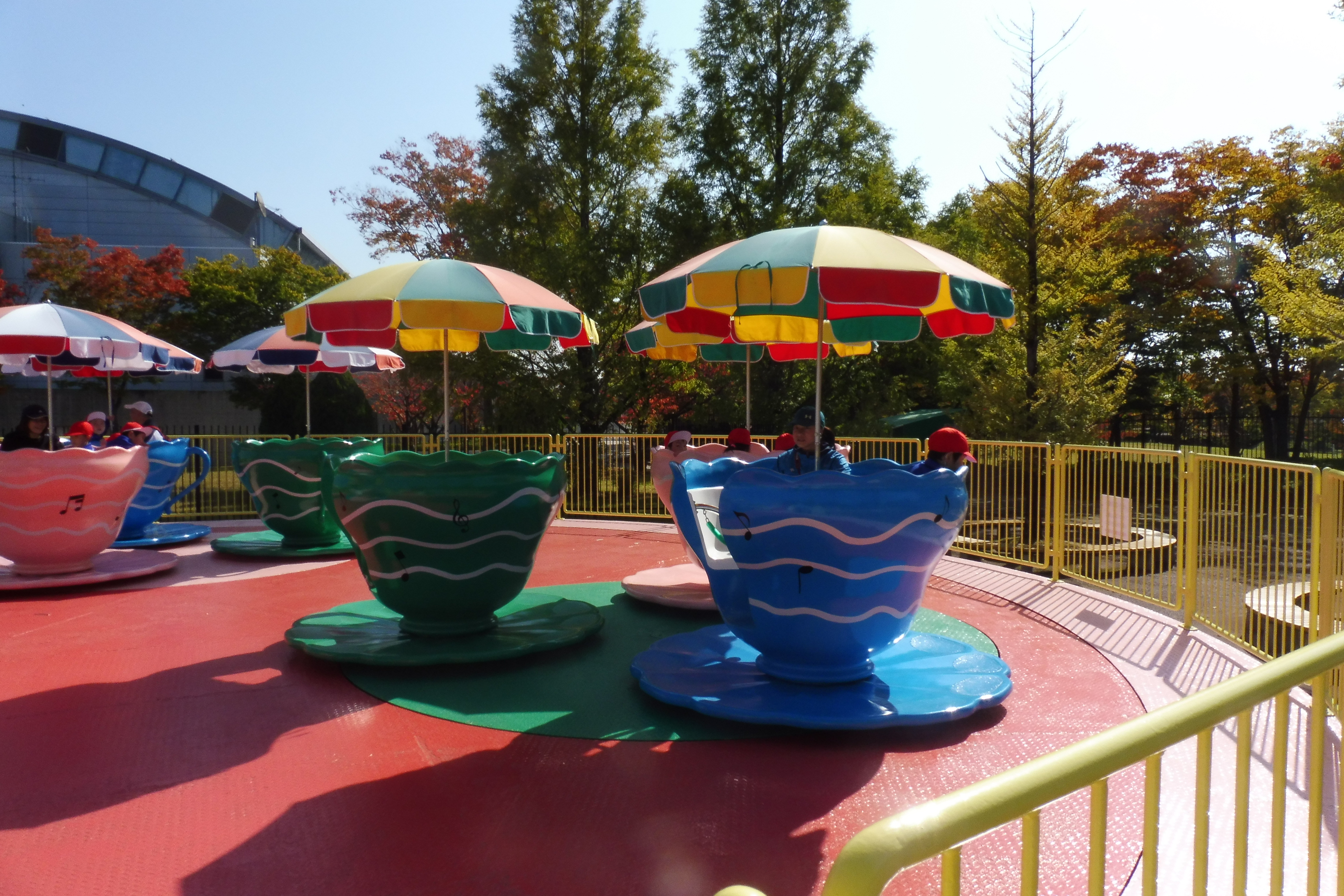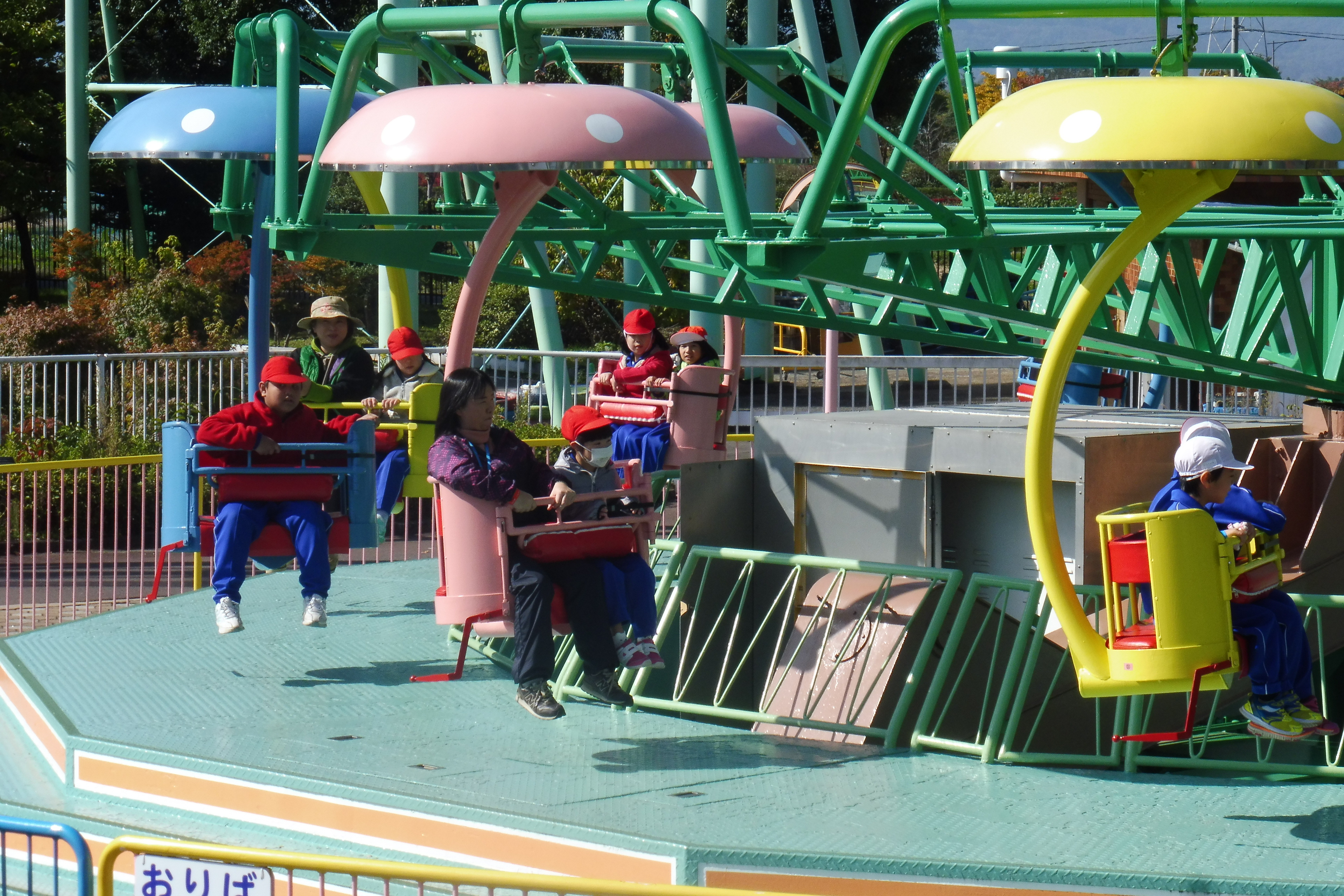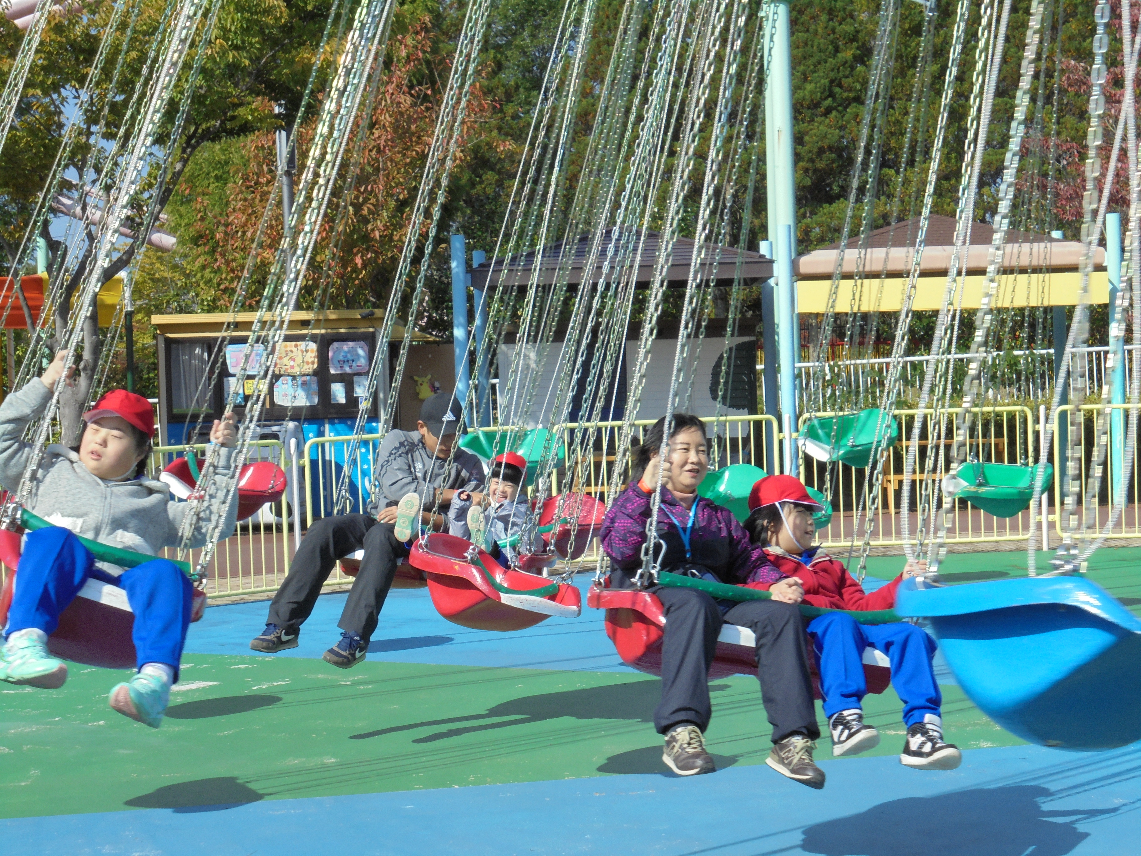 子供たちは、友達や先生と一緒に楽しい乗り物にたくさん乗って楽しい時間をすごすことができました。メリーゴーランドやコーヒーカップ、ゴーカートでは、自分でハンドルを動かして運転手になった気分を楽しみました。