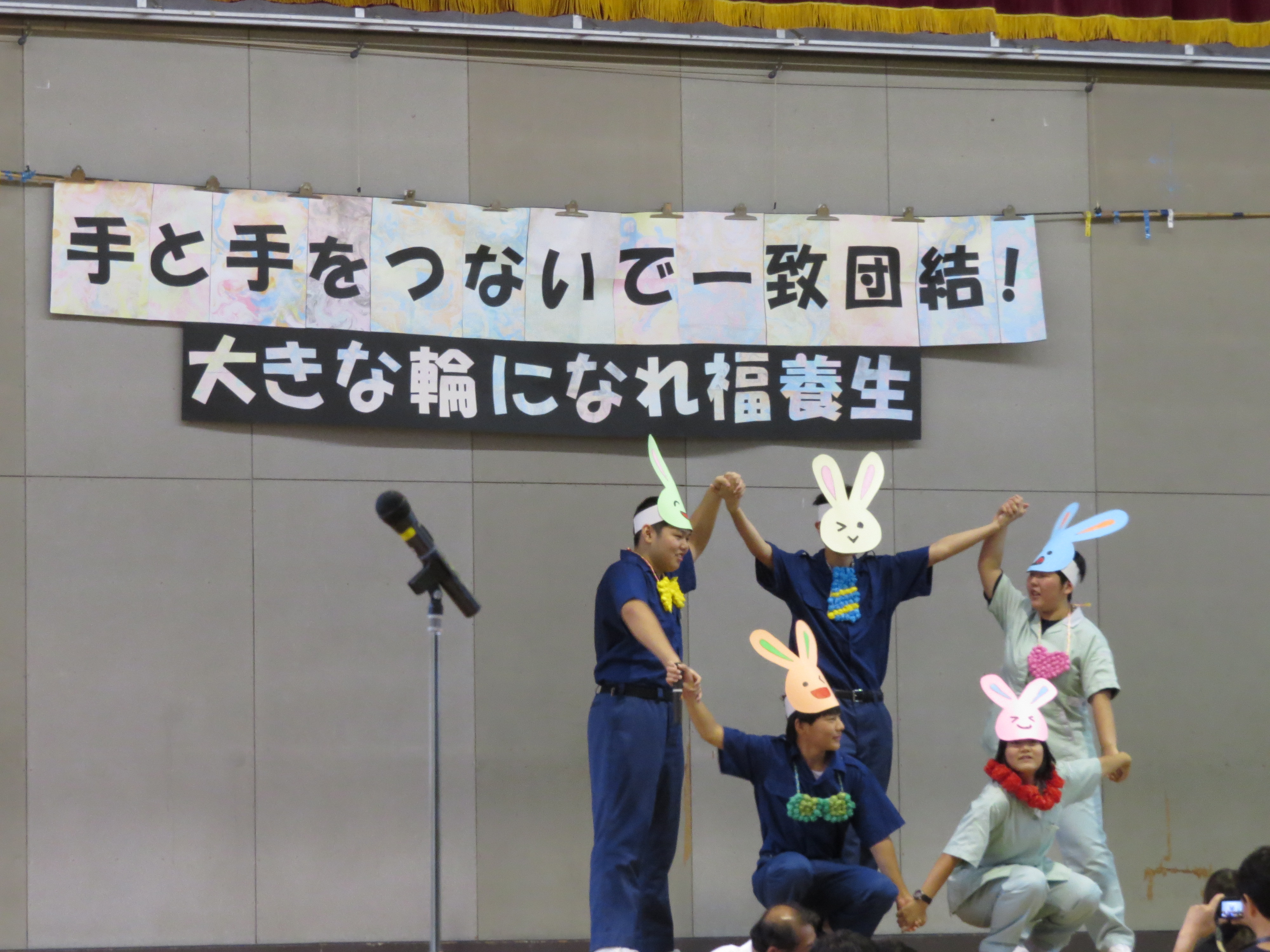 集会では、係の先生から、テーマとテーマキャラクター(福うさちゃん)の発表がありました。みんなで作ったテーマやキャラクターは、みんな笑顔で明るく楽しく生活できるようにしようという願いが込められていますと紹介してくれました。