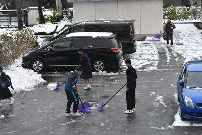 積雪・・・ 2019年4月11日 10時08分 昨夜から雪が降り続き、今朝は本校周辺も積雪していました。 駐車場や昇降口付近も2、3センチ積もっていましたが、教職員とともに生徒たちが雪かきをしてくれました。