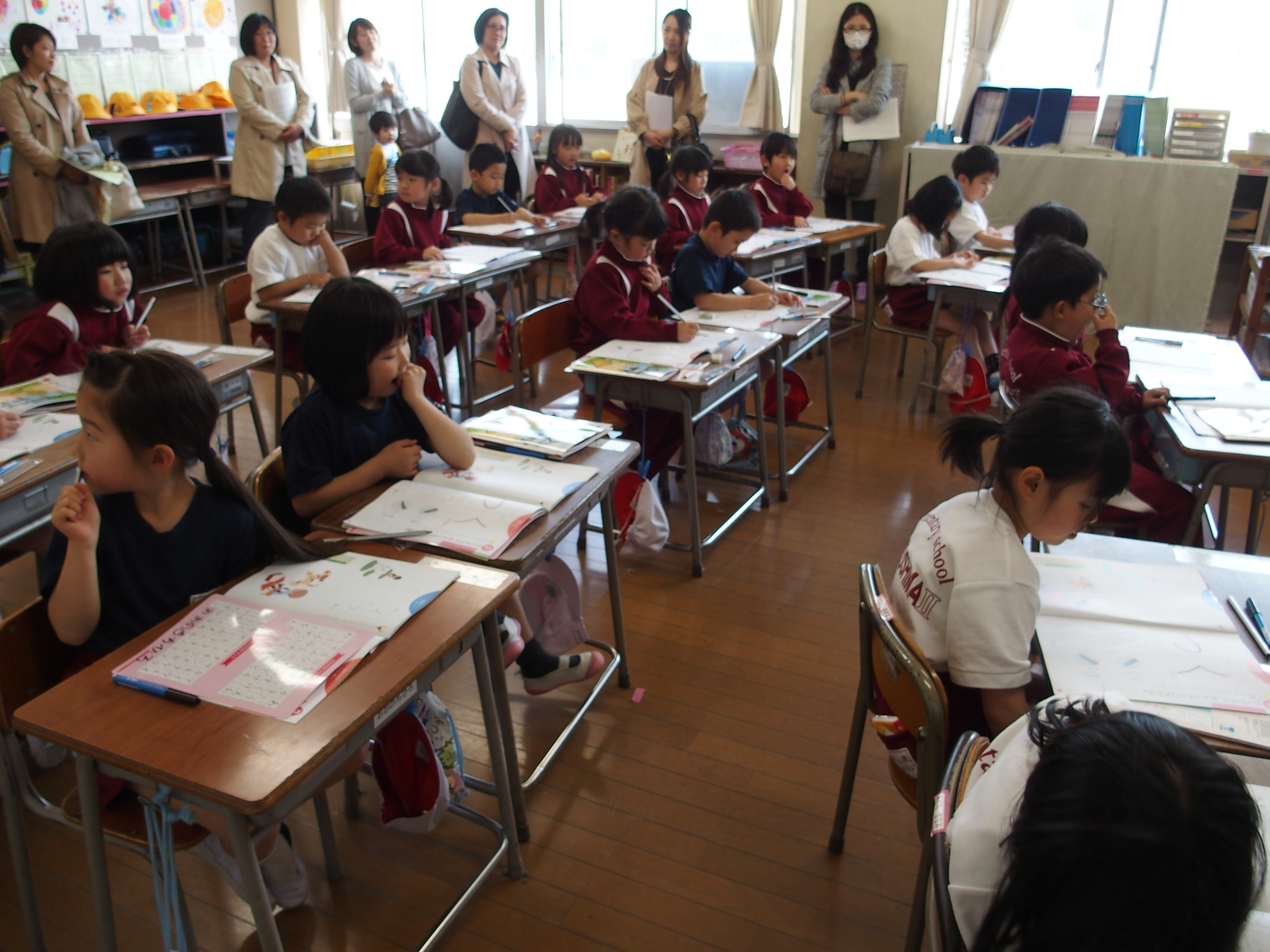 1年生にとっては始めての授業参観でした。姿勢や鉛筆の持ち方に気をつけながら,丁寧にひらがなを書いていました。下校前の着替えの様子も見ていただき,授業以外の場面での子どもたちの様子を様子を知っていただく機会になりました。