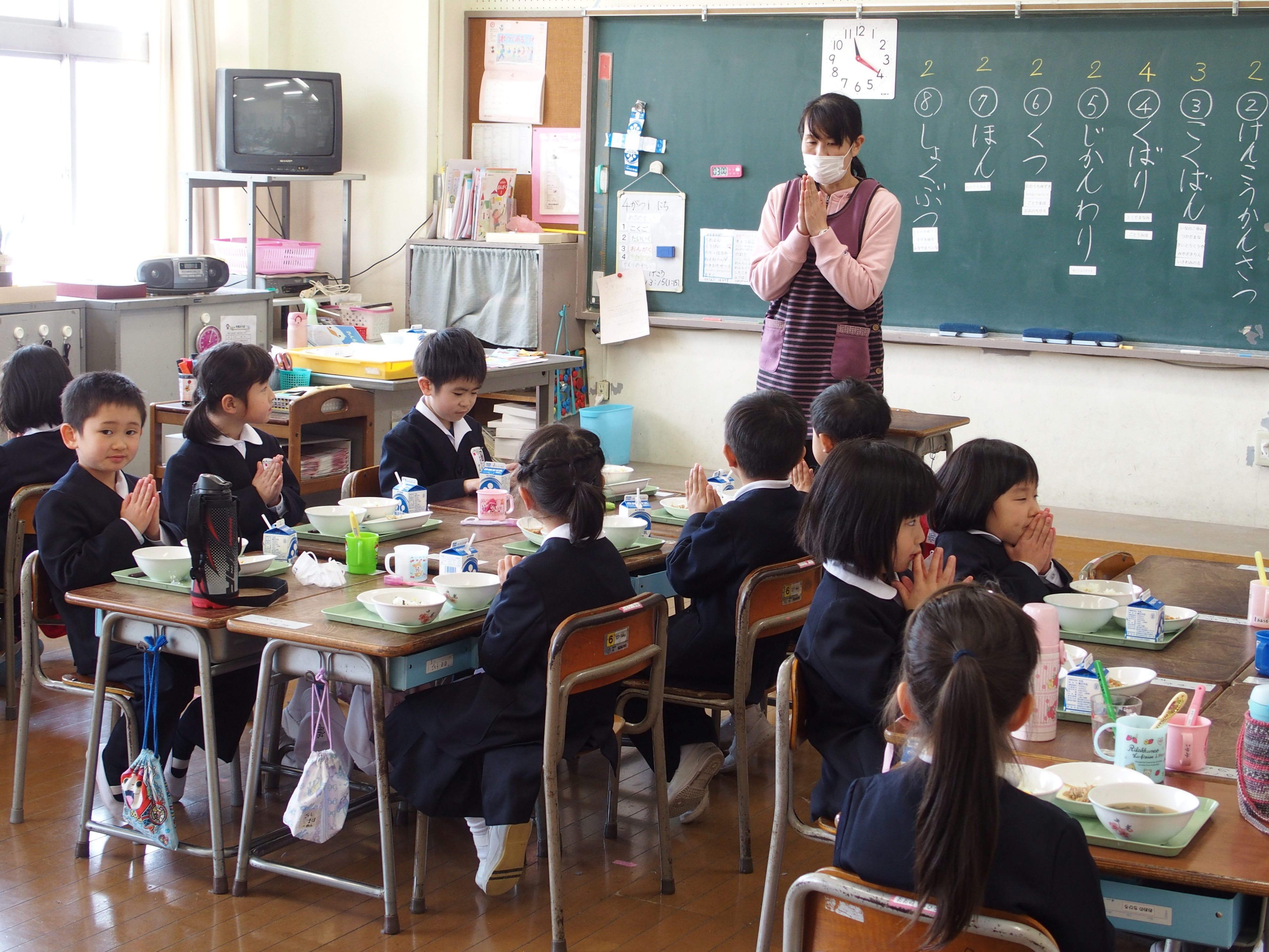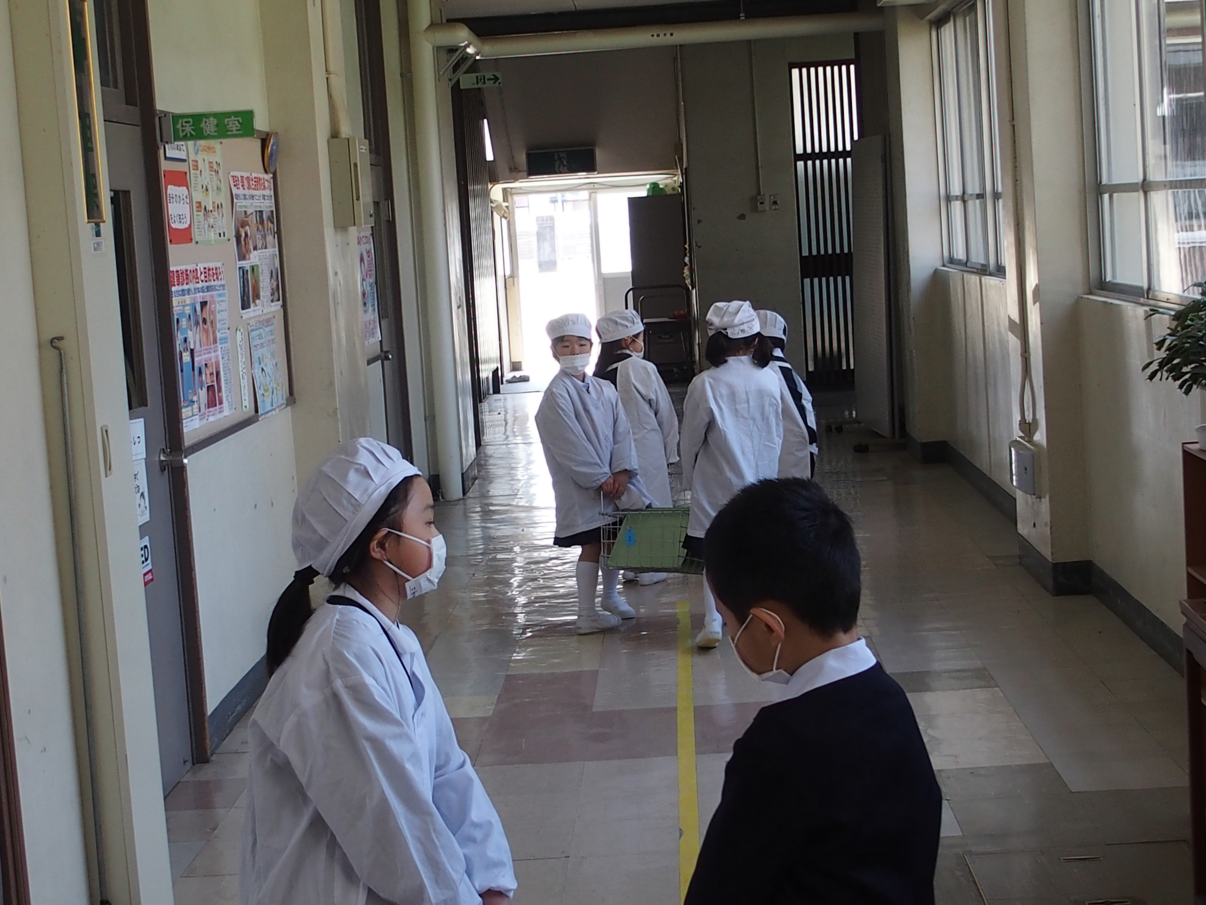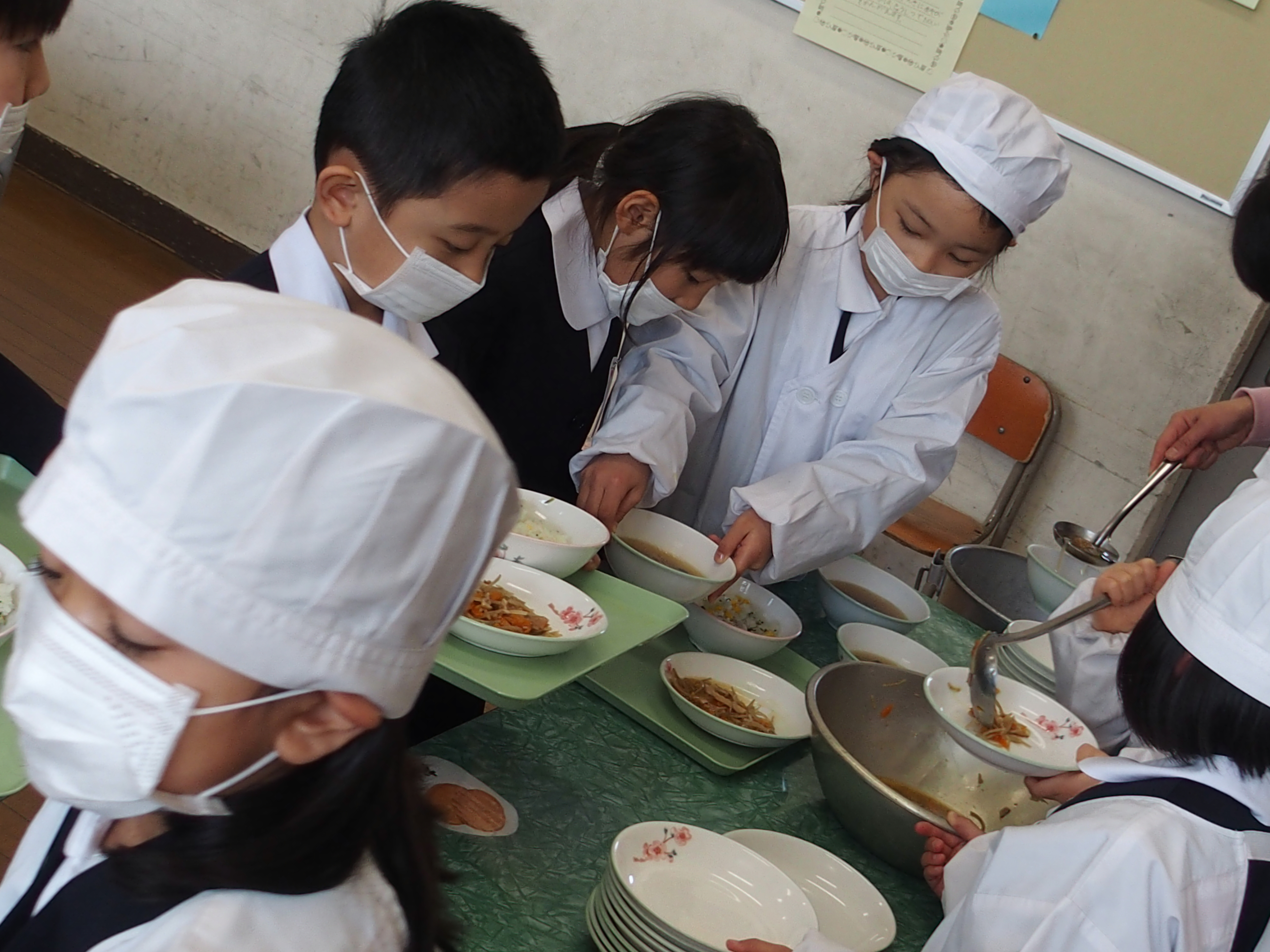 給食2日目の本日17日は,昨日よりも配膳が上手になりました。友達と声をかけあってスムーズに準備をすることができました。(献立:菜の花ごはん,洋風きんぴら,肉団子と春雨のスープ)