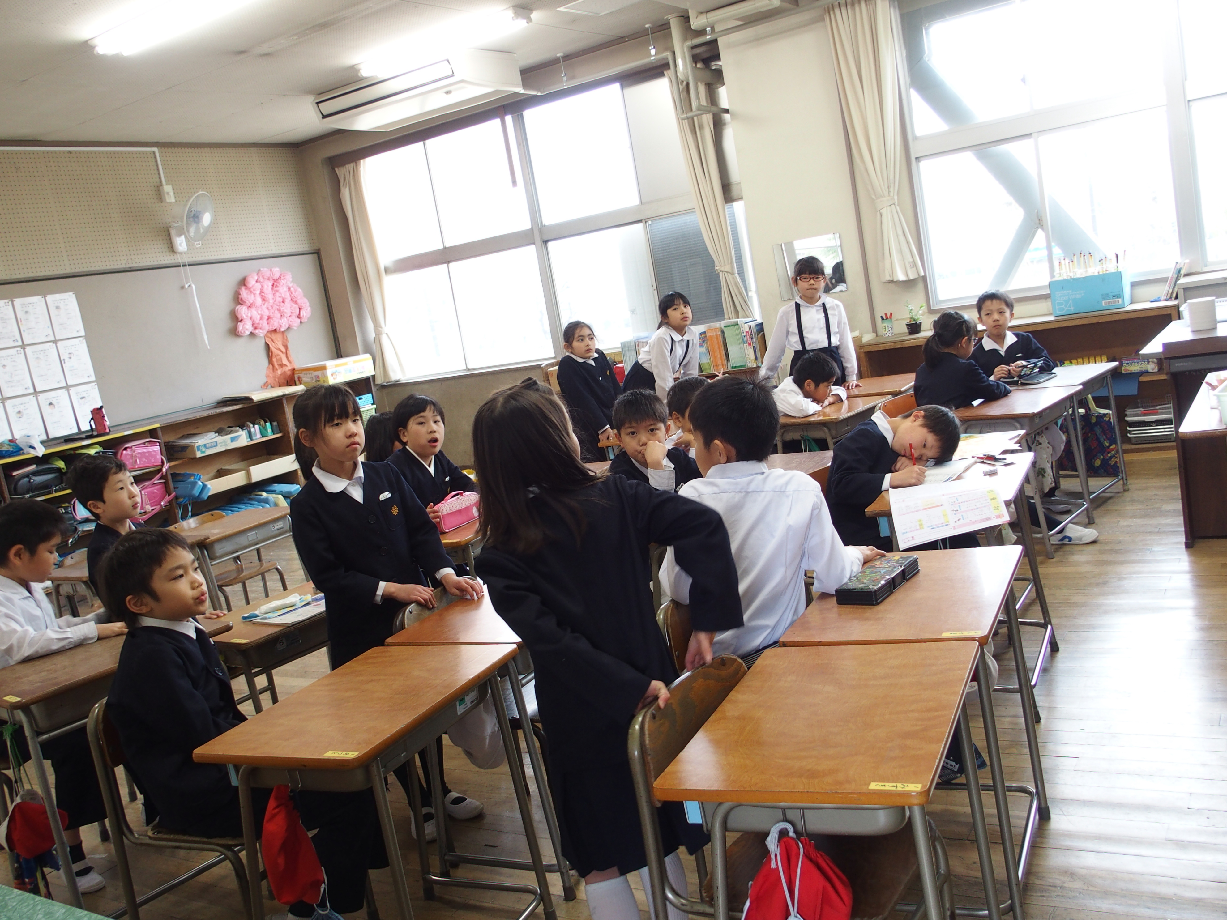 入学式が始まる前の教室で返事の練習をしている時に,勢いあまってイスをひっくり返すほど元気に立ち上がるお友達もいました。