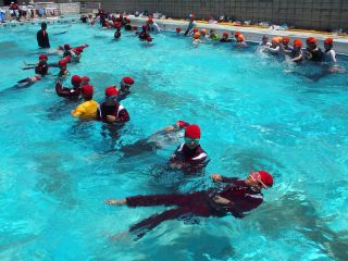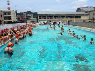 快晴のもと,水泳学習に先駆けて,水難時の対応を学ぶ着衣水泳訓練を3年生以上の学年で行いました。冷たいプールの水で,重くなった衣類で歓声を上げて水に浮く練習や無理なく泳ぐ方法を学びました。事故の絶無に生かしていって欲しいと思います。