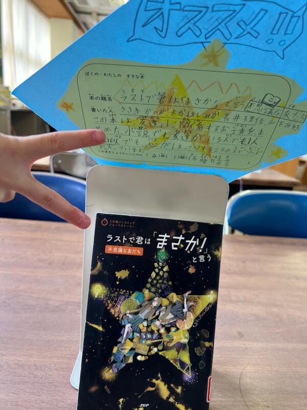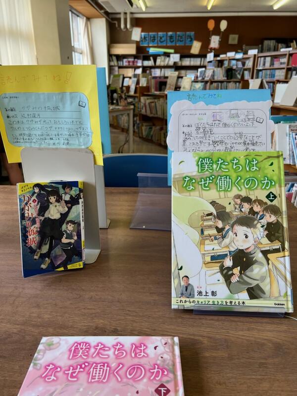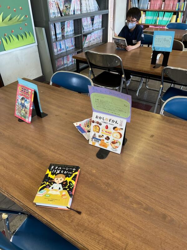 おすすめ!この本 2024年9月13日 13時37分 図書室 図書室のテーブルに本が立っています 本の上には手書きのカードが ほほう、図書委員さんたちからのおすすめの本ですねそれは、そそられますねぇ この本から読んでみようか