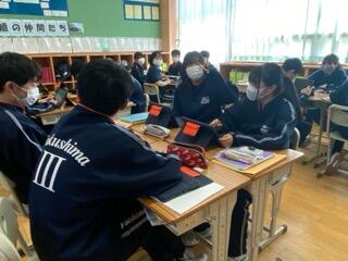 3年生数学の時間では、タブレットを活用しながら協働的な学習に取り組んでいます。課題に対して疑問点を班で共有し、解決に向けて話し合いや実験が行われていました。今回は、ドミノを使った問題に、思い思いの”答え”をもって班で出し合っていました。