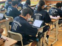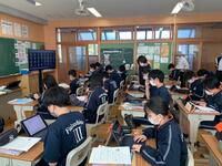 英語科(2年生)では,「私のWhat a day!について伝える英文を書こう。」の課題のもと授業を実施しました。子どもたちは,have to~やdon't have to~等を使用して「自分のハードな一日(What a day!:なんて日だ!)」の英文を書くことができました。また,ICTが個人で書いた英文の全体共有にも役立ったようです。