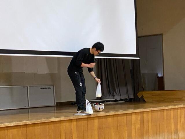 その後、豆腐を使った実験では,驚いたようであり,ヘルメットの重要性について再認識したようです。
