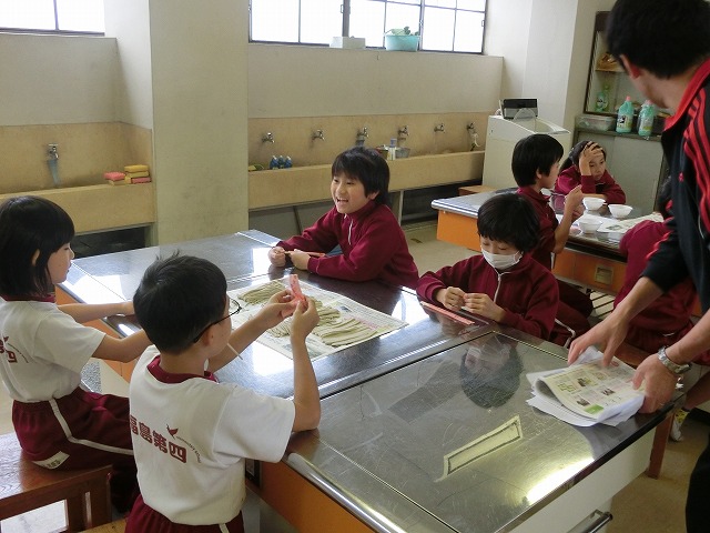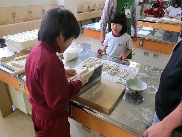 9日、そば打ち名人を招いて、3年生17人はそばづくりに挑戦しました。こねたり、伸ばしたり、切ったりと悪戦苦闘しましたが、出来上がりは上々で美味しそうです。
