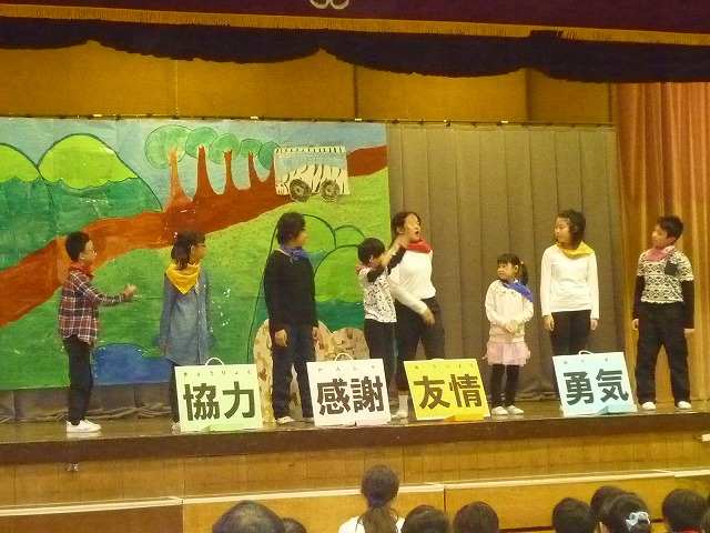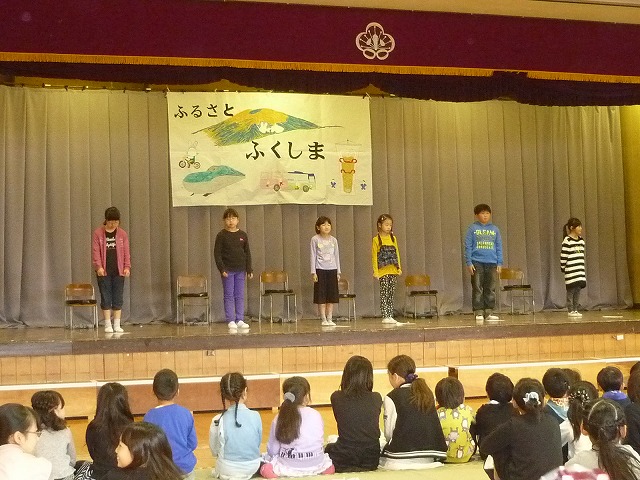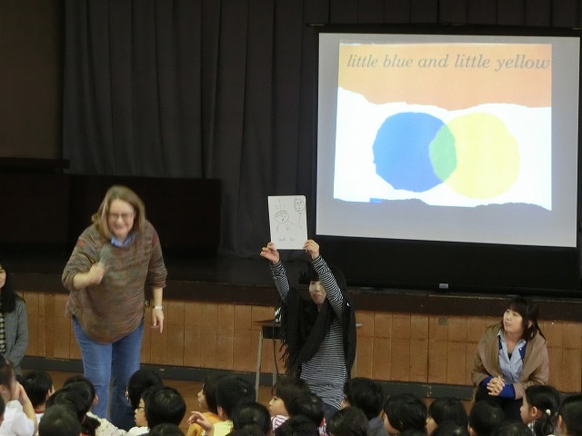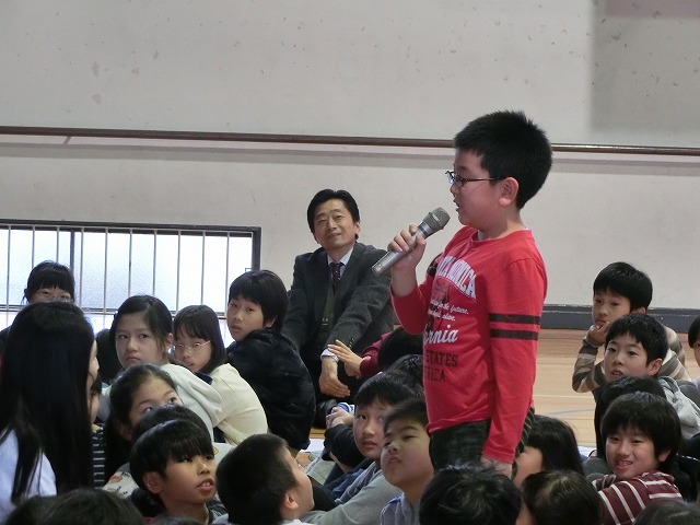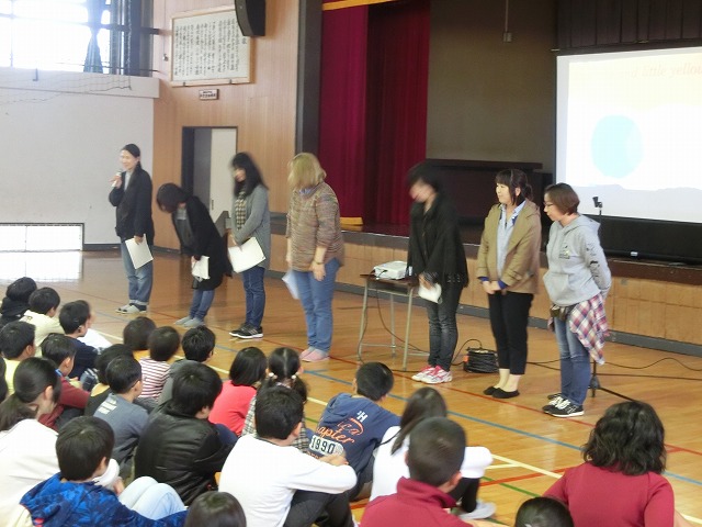8日昼休みの梅校タイムを活用し、日頃朝の時間にお世話になっているボランティアの読み聞かせの方々に、体育館で読み聞かせ会を行っていただきました。英語と日本語によるお話に真剣に聞き入っていました。その後で、図書委員会の児童によるクイズがあり図書室の活発な活用を呼びかけました。
