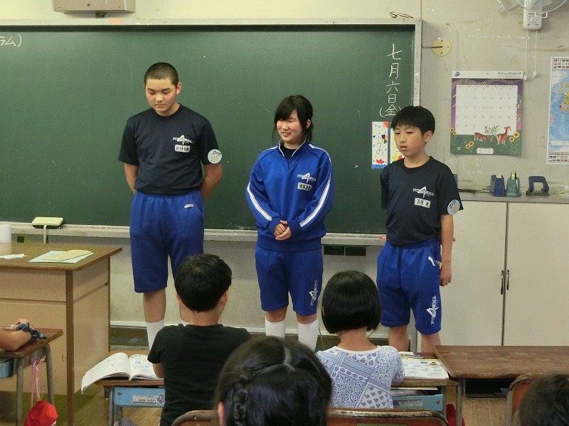 今日から5日間、第四中学校から3名の四小卒の先輩方が職場体験に来ています。暑い週のスタートとなりましたが、元気に参加して体験を進めています。