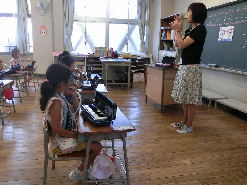 今日は1年生を対象に鍵盤ハーモニカの講習会が行われました。阿部先生のていねいで分かりやすい指導に7名の1年生は真剣です。