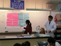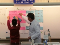 25日に5年生の理科の授業研究を行いました。「流れる水のはたらき」の単元の授業で、川岸の流水モデルを子供達の手で作成し、34名の子供達は真剣に実験、観察をしていました。