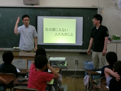 本日、第3学年が総合の時間に「手話教室」を開催しました。聴覚の障害のある人たちの生活の様子や、意思を伝える方法などを学習し、理解を深めることができました。実際に自分たちでもできる手話を覚えて友達同士で手話で言葉を伝えることができました。