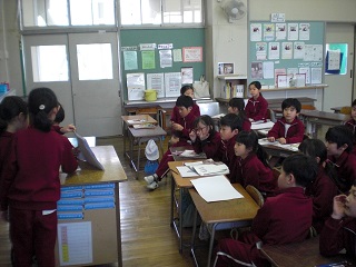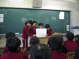 国語科の学習で「ニャーゴ」の物語を紙しばいにまとめ,発表会を行いました。グループ毎に絵や読み方に工夫が見られ,聞いている子どもたちも楽しそうに参加することができました。発表の後には,それぞれの班のよかったところを伝え合い,大きな拍手を送り合いました。