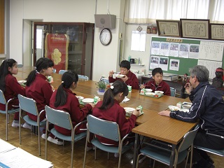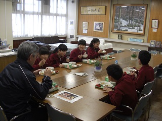 卒業を間近に控え,小学校の給食も残りわずか・・・。子どもたちから,「小学校の最後の思い出に,6年生みんなの大好きな給食を,校長先生と一緒に校長室で食べたい」との声が上がり,この給食会が実現しました。校長室で食べるということにドキドキしながらも,校長先生との会話もはずみ,いつも以上においしい給食の時間になったようです。