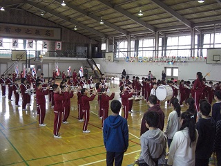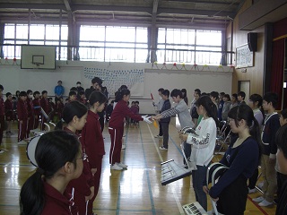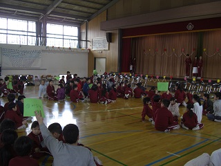 【鼓笛移杖式。6年生から新鼓笛隊へバトンが渡りました。】