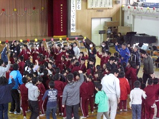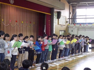 【みんなで「YELL」の合唱。この後,サプライズが!6年生の呼びかけで,みんなでダンス!先生たちも,校長先生もダンスダンス!体育館が笑顔であふれました!】