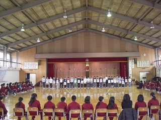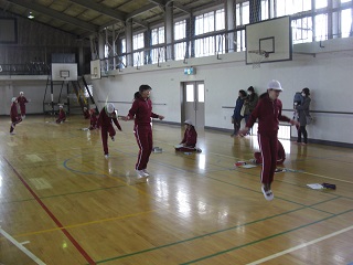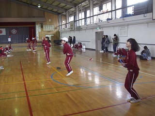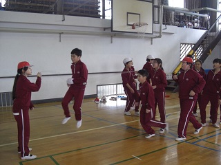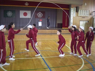 2分間種目跳びで,6年生のTさんが二重跳びを連続137回(約1分30秒)跳びました。持久跳びでは,5年生5分間跳びに7名,6年生6分間跳びに5名が最後まで跳び続けることができました。最後の長縄八の字跳びは,自分たちの目標回数を超えようと,グループ毎に声をかけ合ってみんなでがんばっていました。最後まで粘り強くやり通す5・6年生が大いに力を発揮したなわとび記録会となりました。