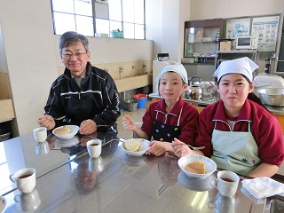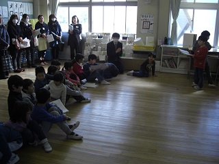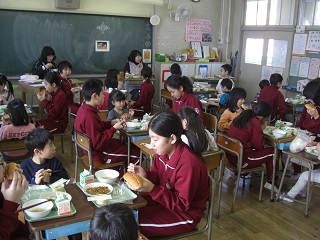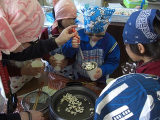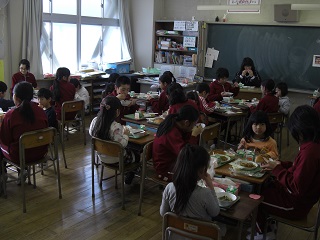 4月から1年生になる,ふくしま西幼稚園の年長さんが,四小に来て給食を体験しました。出迎えた5年生が一人ひとりに声をかけ,給食のもらい方などをやさしく教えてあげました。お世話をする5年生がとても頼もしく見えました!!