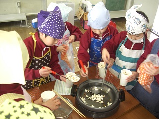 【1年生】ポップコーンを作って,みんなでおいしくいただきました。