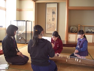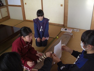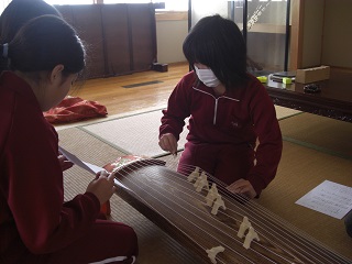 音楽の時間,琴で「さくらさくら」を演奏しました。一人一人が弦をおす感覚や琴の音色を味わうことができました。