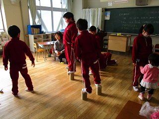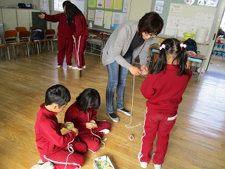 生活科の学習で,昔遊びをしました。今回は,お母さん,おばあちゃん,おじいちゃんを講師に,おはじき,お手玉,けん玉,だるま落とし,あやとり,コマ,ゴム跳び,竹ぽっくりを楽しみました。