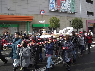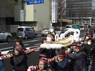 今日行われました信夫三山暁まいりで,3年生,5年生が「子どもわらじ」を担いできました。昨日から降り続いた雪で,実施できるのかどうか心配でしたが,スタート前には雪も風も止んで,雲間からは日も差してきました。子どもわらじは,なかなかの重量でしたが,みんなで声を出し合って,ゴールの駅前まで無事に運ぶことができました。みんなよくがんばりました!沿道にはたくさんの市民の方が見に来られていました。四小の子たちの元気な姿をお見せすることができました。ゴール後は,みんな「おなかがすいた~」と言っていました。今日の給食は子どもたちが楽しみにしている恒例の「わらじつくね」。おいしくいただきました。これで今年も「無病息災」「五穀豊穣」まちがいありません。最後になりましたが,お手伝いの保護者の皆さん,ありがとうございました。