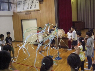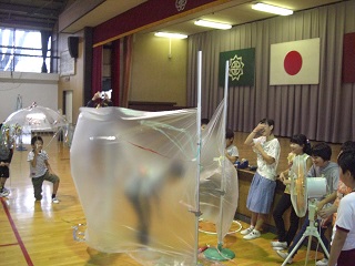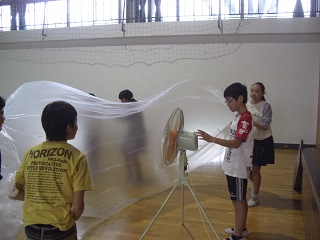 聾学校福島分校の6年生と一緒に,図工の授業を行いました。授業は「材料を生かして,風のすがたが美しく見えるようにすること」をねらいに,グループで楽しく協力しながら表現活動に取り組みました。残念ながら,外はあいにくの天気でしたので,体育館で扇風機で風を作っての活動となりましたが,体育用具を使いながら,いろいろなアイデアを出し合い,ダイナミックな作品や楽しい作品を作りました。聾学校の友達とも,上手にコミュニケーションを取りながら活動していました。