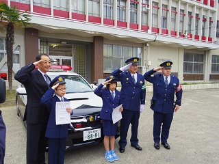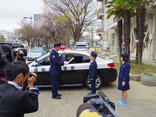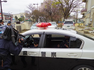 6年生の2人が,春の交通安全運動に伴う広報パトロールを行いました。パトカーに乗って,地域の皆さんに交通安全を呼びかけました。テレビ局,新聞社も取材に来ました。